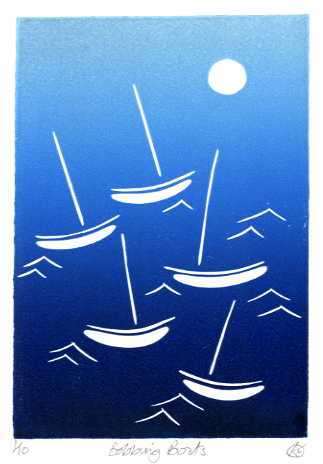 Quick but precise carvings into the lino and printed using a blend of blue inks gives this print a lively feel – you can just imagine boats bobbing in the bay! My first linocut print for a few years but enjoyed printing this at Jo Morley’s studio at Kemps Quay in Southampton this Spring on my first visit to try out her new facilities. Great to be printing alongside other Cowprint members again!