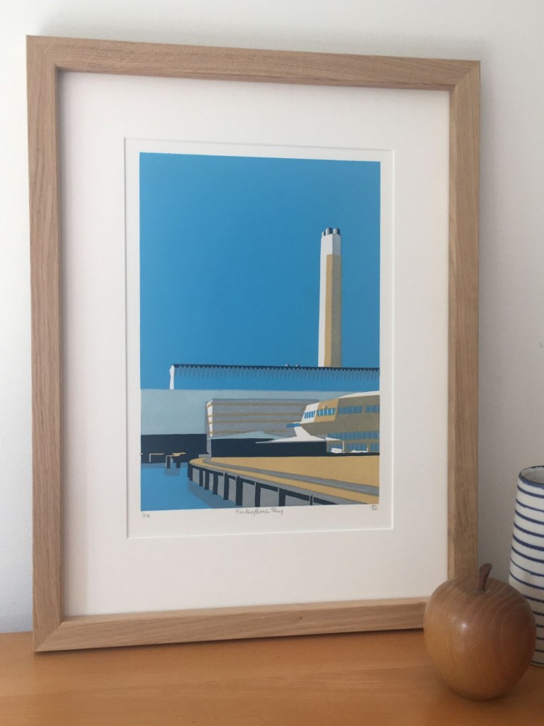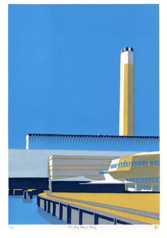 The print is made from five linocut plates; first the blue sky, second the yellow chimney and concrete clad control room, then the light blue grey of the corrugated cladding to the turbine hall, the fourth plate is the grey shadows to the chimney, the zig-zag glazed cornices of the turbine hall, and finally to cap the roof of the turbine hall and emphasize the dock walls is a dark blue plate.