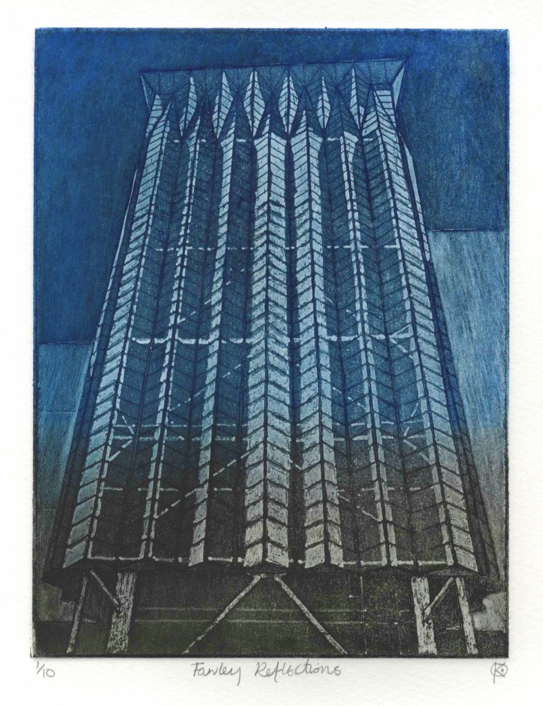 This etching explores the striking glazing structure of the turbine hall at Fawley Power Station. Its towering glass cornices zig-zag across its north-east and south-west facing facades and return to ground level at its north-west end. I have used acrylic spray paint to create a fine aquatint for darker areas of the print and a wax resist for the glazed areas to create lighter areas to simulate the reflected sky on the glazing.