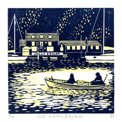 My print depicts ‘Gull’ passing the picturesque 18th century inn, the Jolly Sailor, at Old Bursledon, which was made famous back in the 1980’s as one of regular set locations for the BBC drama ‘Howard’s Way’. The pub is a great place to stop for a drink or a bite to eat and watch the world go by overlooking the banks of the River Hamble.
