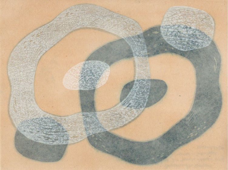 A mokuhanga print using the ‘taku-zuri’ technique (rubbing print) and ‘goma-zuri’ on Pansion K155 with two sheets of Yanase Washi gampi overlaid and mounted on the Pansion and waxed to give a semi transluscent effect. The print uses three blocks of wood and three colours of pigment including watercolour and gouache, and 6 passes of colour. This is one of several prints created whilst on the artist in residency basic training programme at MI-LAB, Echizen in November 2024.