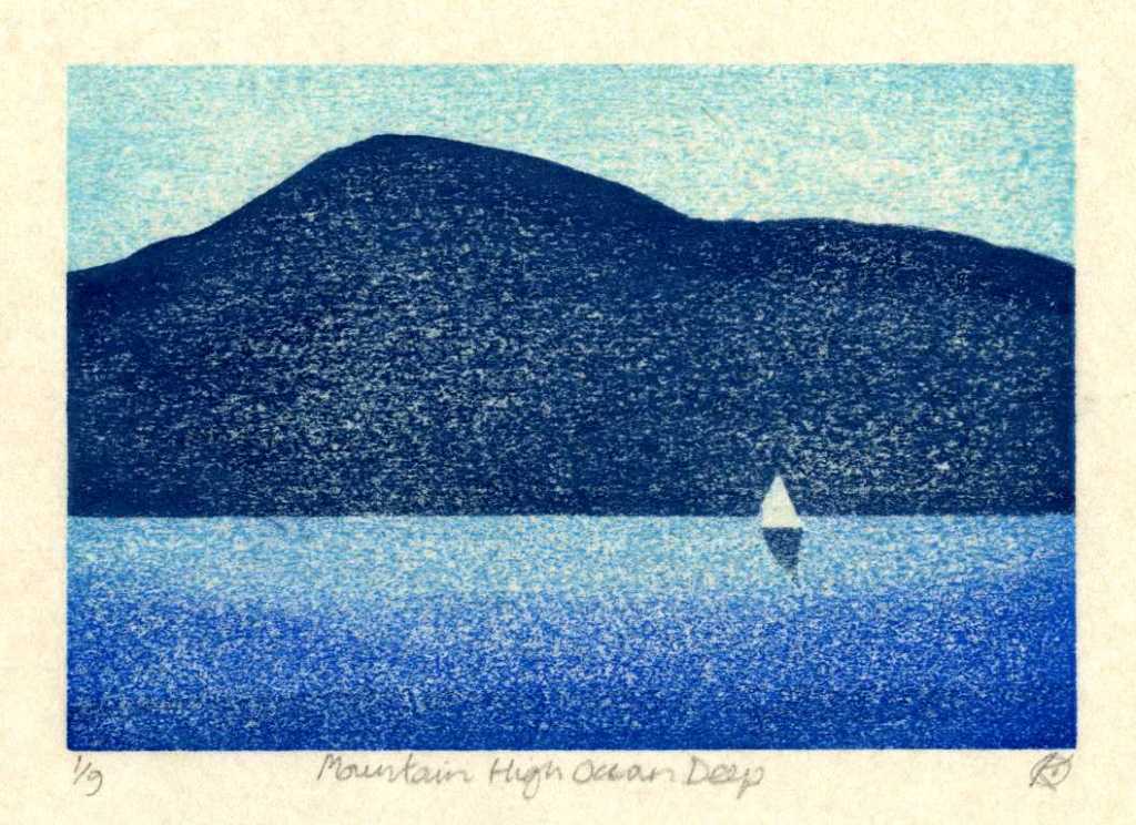 This print is inspired by one of our few days of sun, sailing in the shadow of Croagh Patrick, County Mayo, a distinctive pyramid shaped mountain famed for its site of pilgrimage, towards the surreal landscape of ‘drowned drumlin’ islands of Clew Bay.