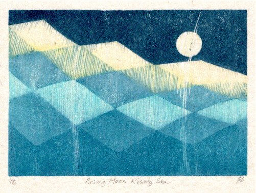 I spend many hours watching the movement of the sea when I’m sailing and find the overlapping of different wave patterns particularly fascinating. This print explores wave forms using a three dimensional hyperbolic wave form, reduced on each block allowing the use of a different coloured pigment to create an abstract image of a rising sea with cresting waves under a rising moon. I have cut the blocks with a fine V tool Sankakuto to indicate the breaking waves and broken reflections of the moon as the waves rise and fall.