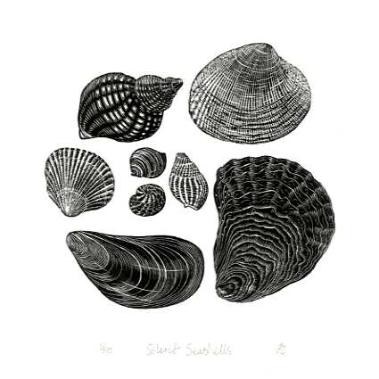A collection of wood engravings of shells native to the Solent, the stretch of sea between the Isle of Wight and Hampshire. These include a native oyster, a mussel shell, a cockle shell, a whelk, a striated Venus shell, a flat top shell, a periwinkle and a netted dog whelk. I picked these shells off the beach at Hamble, on the shores of Southampton Water during the first ‘Covid’ lockdown in 2020. Each is engraved on a separate block of lemonwood except for the periwinkle and the top shell which are on one block. I have carefully arranged them so that I could print them altogether and to make an attractive composition – I like the way the negative space between looks like a starfish!