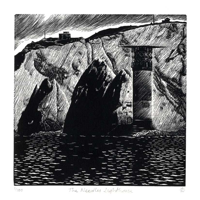 The Needles Lighthouse was built in 1859 and automated in 1994 and marks the western end of the Isle of Wight and the entrance to the Solent. The lighthouse has special significance for me as it also marks the start of many exciting sailing adventures. I have long been fascinated by the pattern of formations that diagonally cross the three chalk stacks of the Needles and the cliffs behind and thought that they and the lighthouse would make a interesting and challenging subject for a wood engraving!