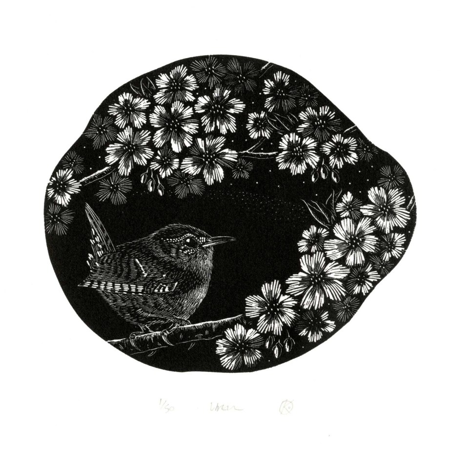 This print was inspired by a poem of the same title by Scottish poet Richard Price and the little wren that flits around our great white cherry tree in our garden. I had been thinking about engraving a wren when I saw an open call in the Journal of the Society of Wood Engravers, which I subscribe to, for prints inspired by poems for the exhibition ‘Nature Prints and Poems’, mentioned above. I love haiku poems, and although this is not strictly one I love the simplicity of Richard’s poem and how it captures the fleeting glimpse you get of these shy little birds so well.