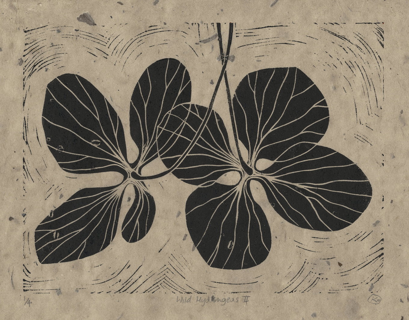 During this course we had guest tutoring from Kate Dicker, a wood engraver and an elected member of the Society of Wood Engravers (SWE). I was intrigued by the detailed structure of dried hydrangea flowers and created a number of prints in different techniques (including Wild Hydrangeas II printed on Lokta paper) studying the flowers at different scales from macro to micro. Working in lino I struggled to get the detail I wanted and seeing Kate’s graphically bold but detailed wood engravings I wondered if wood engraving might be the answer.