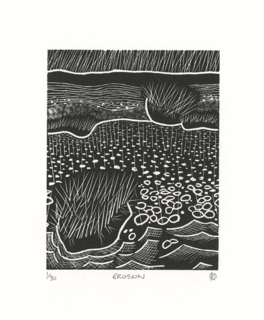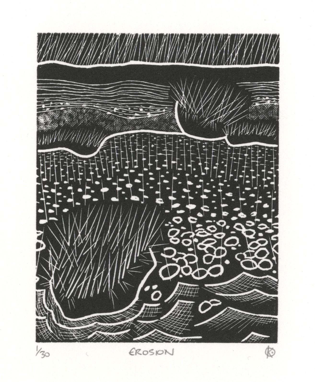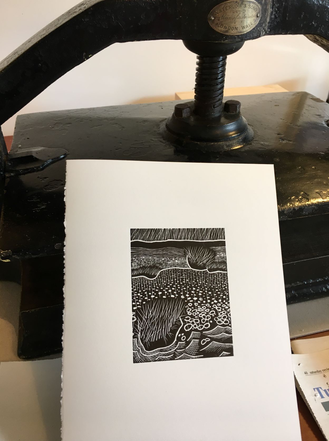 In 2018 Katherine Anteney at RHP asked Jutta Manser, a long term member of RHP and an elected member of SWE to run an introductory course early in 2019. I bought Simon Brett’s Wood Engraving – How To Do It book (which is excellent) and some tools to get started. Agnes Miller Parker’s bold studies of fish and animals, influenced my design for my first wood engraving Koi Carp . My second engraving, also created on Jutta’s course, was ‘Erosion’, a design influenced by the modernist pattern making of Geoffrey Wales and I was delighted when this was accepted in the St Barbe Open Exhibition, Lymington, in 2019. Both of these were editioned on an antique Waterlow copying press.