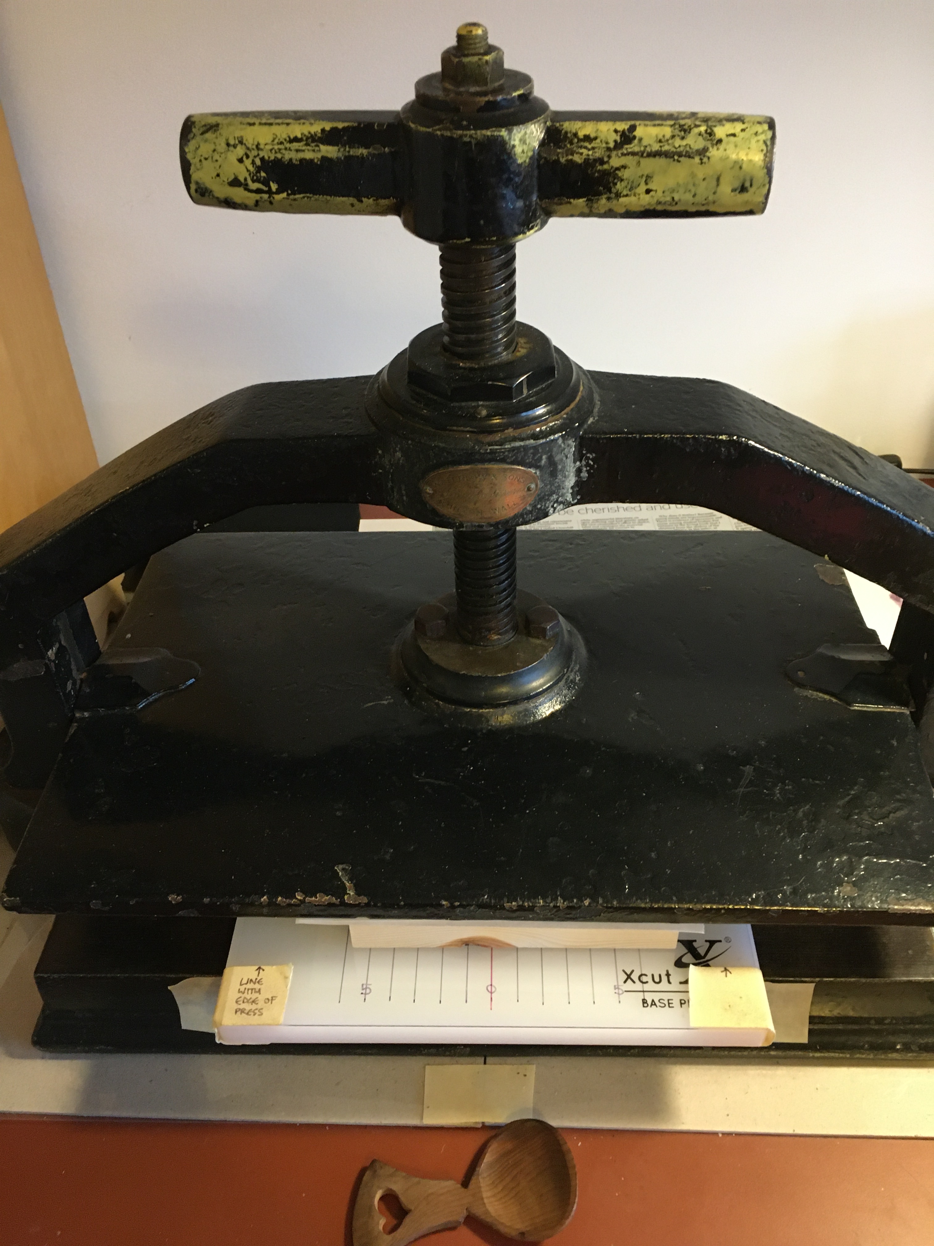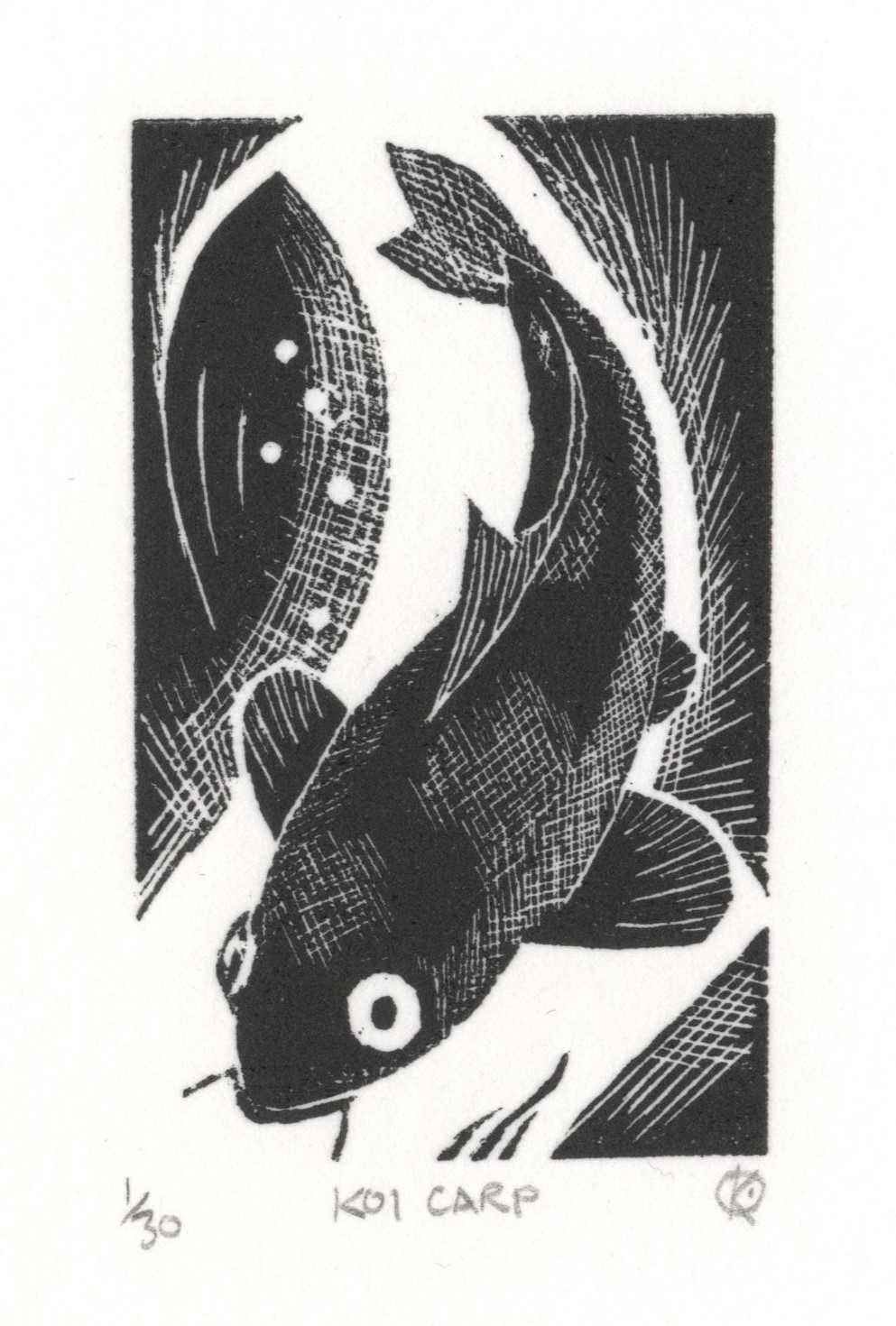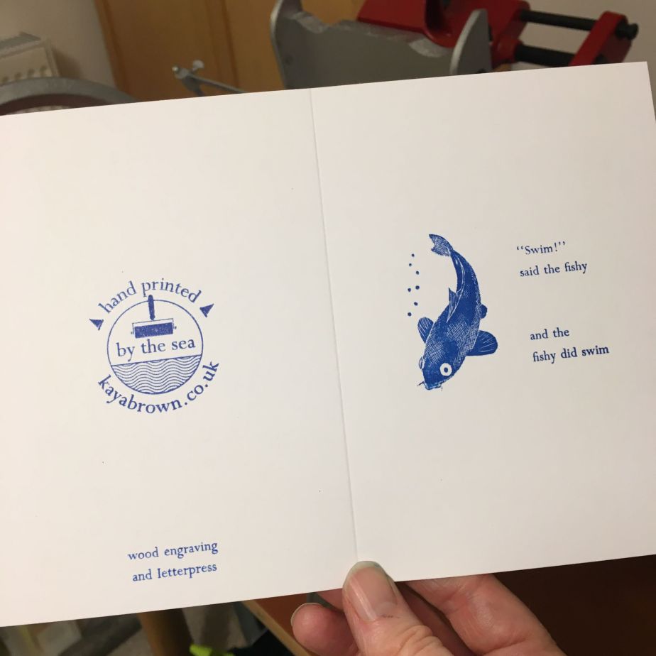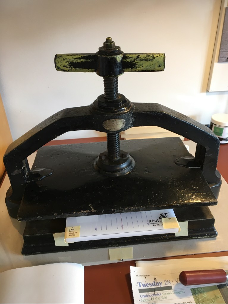 In 2018 Katherine Anteney at RHP asked Jutta Manser, a long term member of RHP and an elected member of SWE to run an introductory course early in 2019. I bought Simon Brett’s Wood Engraving – How To Do It book (which is excellent) and some tools to get started. Agnes Miller Parker’s bold studies of fish and animals, influenced my design for my first wood engraving Koi Carp . My second engraving, also created on Jutta’s course, was ‘Erosion’, a design influenced by the modernist pattern making of Geoffrey Wales and I was delighted when this was accepted in the St Barbe Open Exhibition, Lymington, in 2019. Both of these were editioned on an antique Waterlow copying press.