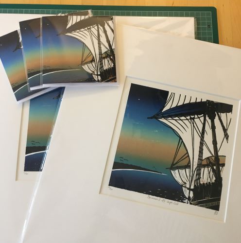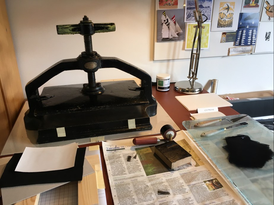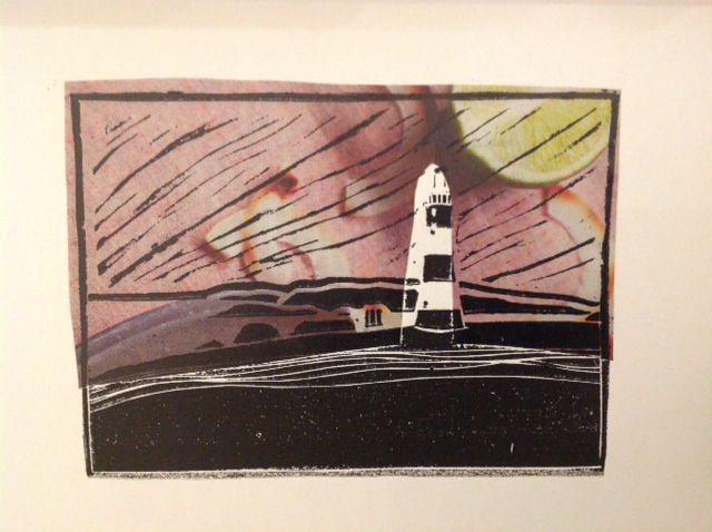I had not done any printmaking at all until my first taster in 2012, when I tried mono-printing with Marian Taylor on a mixed media course at St Ives School of Painting, studying the work of Wilhemina Barns-Graham. In 2015 an urban sketcher friend introduced me to Sarah Mander at Red Hot Press (RHP) in Southampton, where, following a taster session in mono-printing with fellow urban sketchers, I signed up for a beginners course introducing linocut, card cuts, drypoint and etching techniques, and sold my first print – a chine colle and linocut of Smeaton’s Tower!