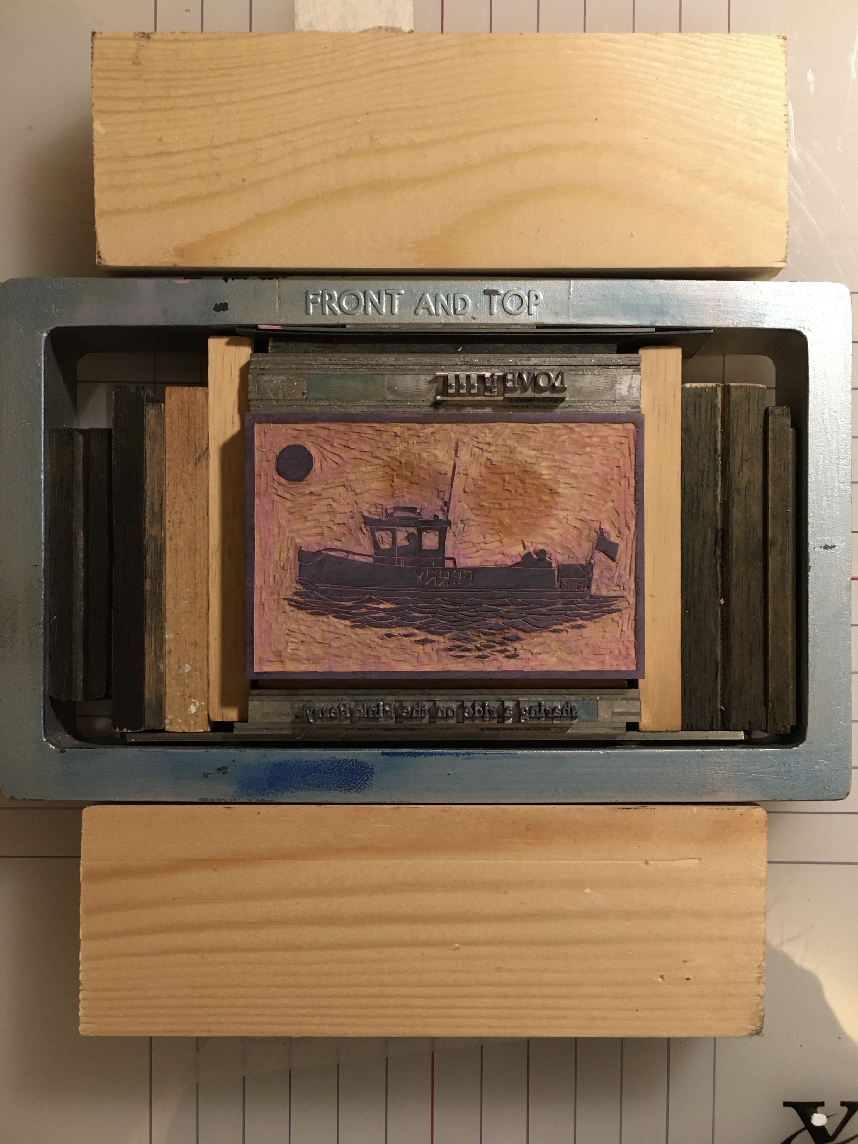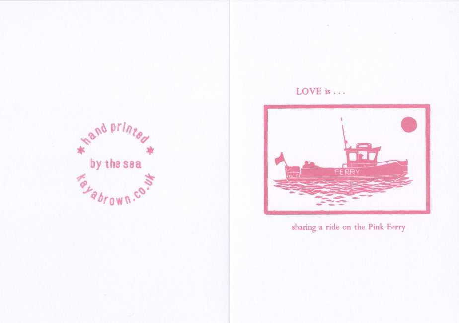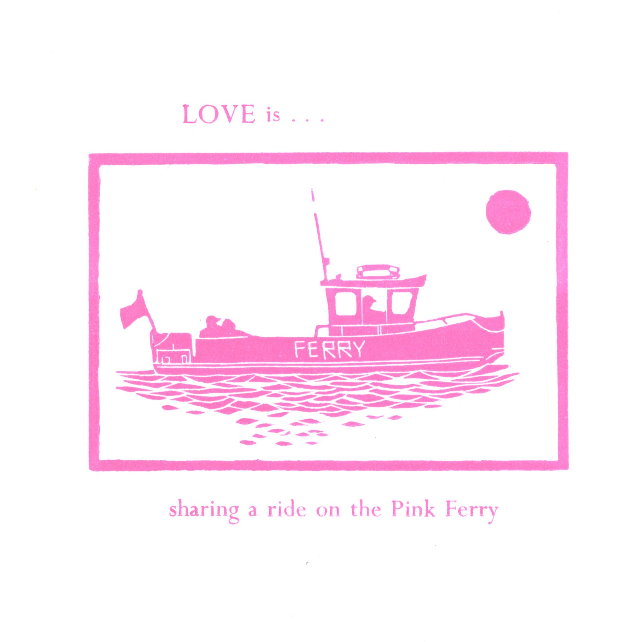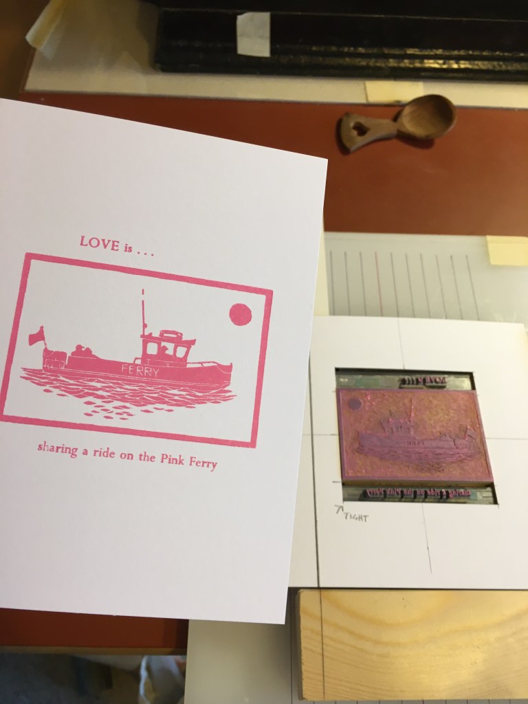 During the following couple of years I engraved a few small designs including ‘Love is … sharing a ride on the Pink Ferry’, set with type and printed as a card – so popular its now in its sixth edition! Other designs included ‘Snowdrops’ printed with a haiku poem I had composed (an occasional pastime!) influenced by the engravings of Lucien Pissarro, a founding member of the SWE.