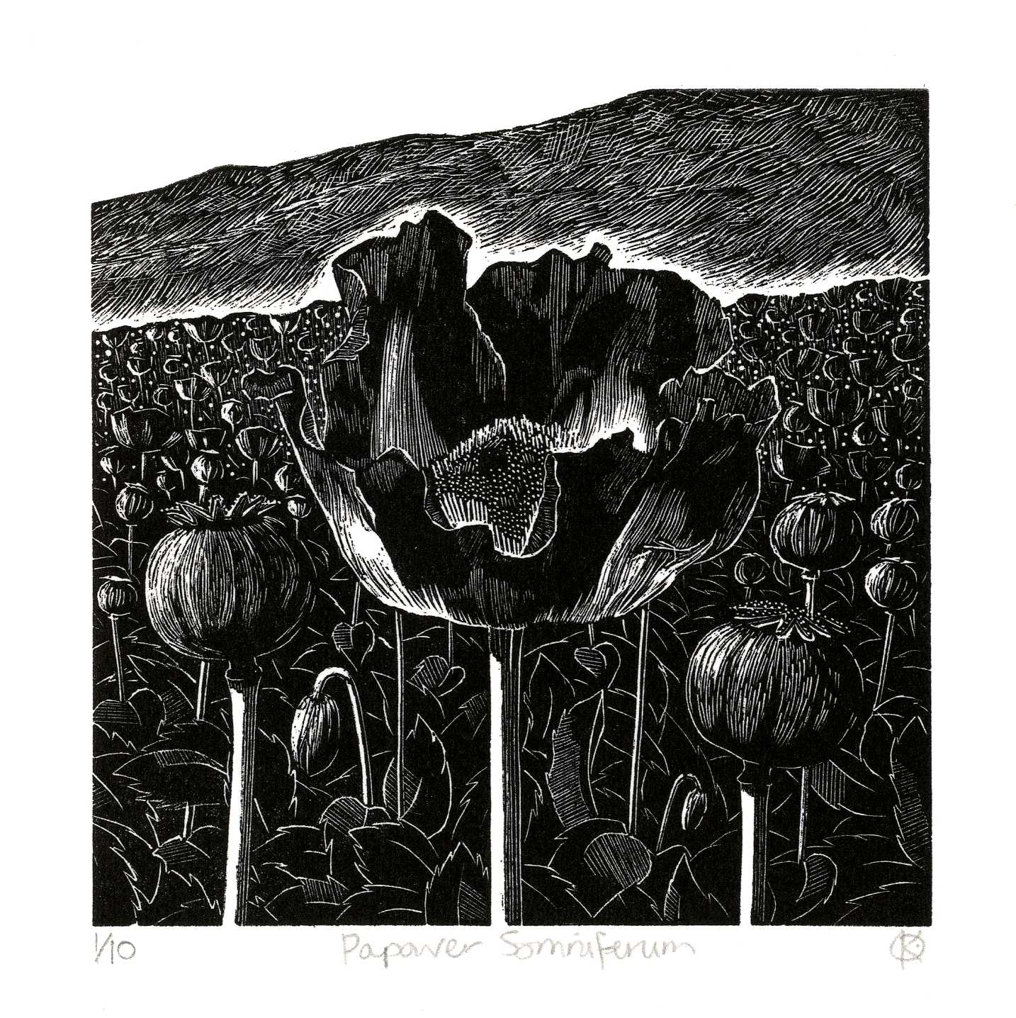 In 2021 the troubles in Afghanistan prompted an edition of prints for the 20:20 print exchange run by Hot Bed Press, illustrating the opium poppy fields ‘Papaver Ultramarinus’, printed in an ultramarine colour, derived from Lapis Lazuli mined in the Hindu Kush. A small edition printed in a more sombre black ‘Papaver Somniferum’ followed, and was thrilled to hear that it was selected for the prestigious annual exhibition of the Society of Wood Engravers, now in its 85th year, at the Bankside Gallery, London, in February 2023. From here it spends the year touring the country, exhibiting at five other galleries.